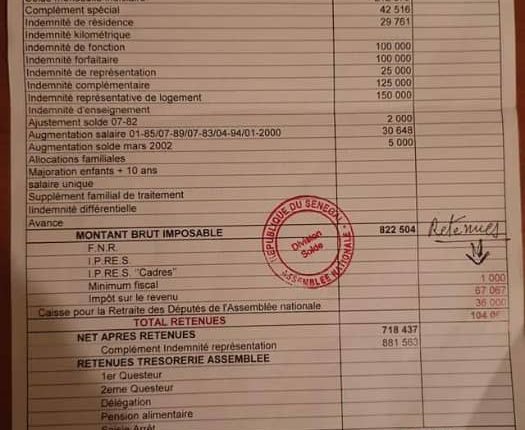 D’abord sur les faits : contrairement au salaire sur lequel l’impôt est prélevé selon des critères liés au statut social du travailleur (marié ou célibataire, nombre d’enfants en charge, etc.), à l’Assemblée nationale, c’est l’alignement. Dans le premier cas,deux salariés ayant le même montant brut de salaire peuvent avoir un net à payer très différent au regard de la différence de charges. Dans le deuxième cas, les députés qui n’occupent pas de poste de responsabilité ont tous le même traitement quelle que soit leur situation matrimoniale. Il en est de même pour les autres selon les types de responsabilités que l’on occupe. Mais il s’agit toujours d’un alignement. Tu verras au bas de ce post mes 2 fiches de paie où on lit le type de retenues et les montants.