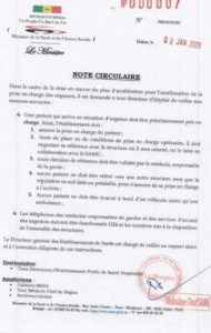 Mbourtv – Santé : Le ministre de la Santé veut mettre un terme au calvaire que vivent les patients dans les services d’urgence de nos hôpitaux. En effet, Abdoulaye Diouf Sarr a adressé une lettre circulaire aux Directeurs des hôpitaux leur donnant des consignes fermes quant à la bonne prise en charge des patients qui arrivent dans les services d’Urgence. Ci-dessous ladite lettre.