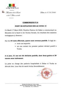 Selon le Directeur de cabinet et porte-parole du ministère de la Santé et de l’Action sociale, Dr Aloyse Diouf, sur 44 tests effectués, 4 sont revenus positifs. Il s’agit de 3 cas importés. Le quatrième cas positif est un proche du premier cas confirmé à Touba.