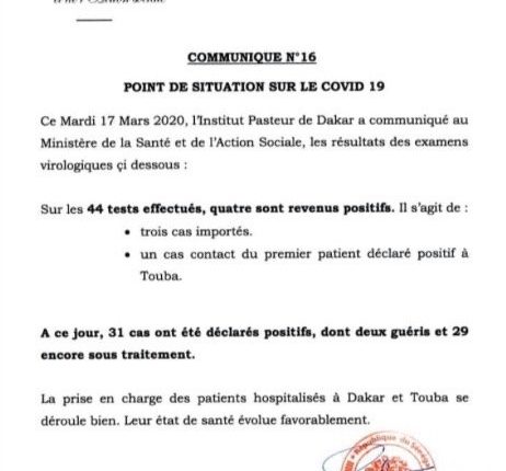 Actuellement, le pays compte, au total, 31 cas dont 2 guéris et 29 sous traitements. Tous sont dans une situation stable, selon Dr Diouf.